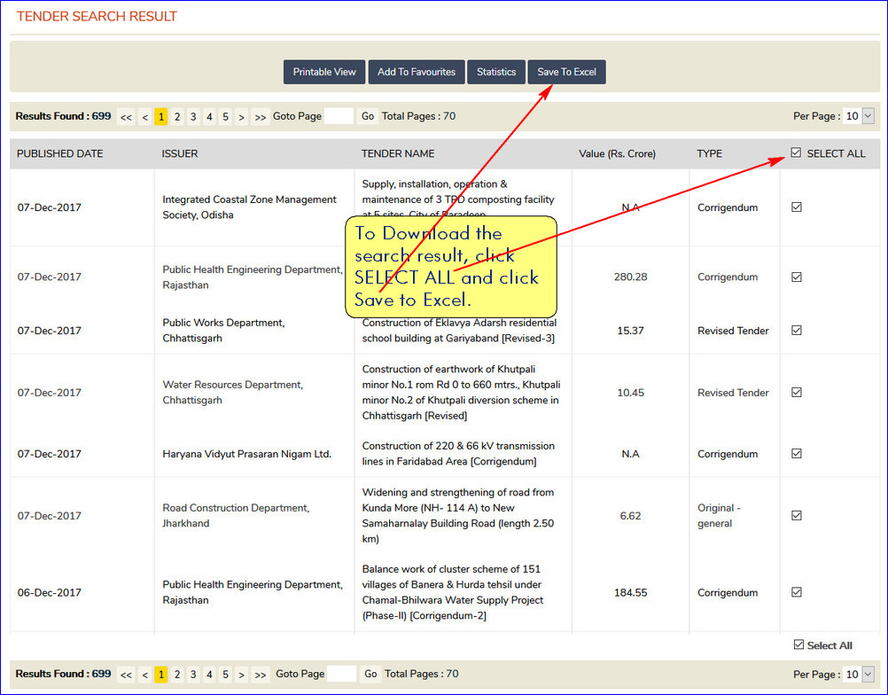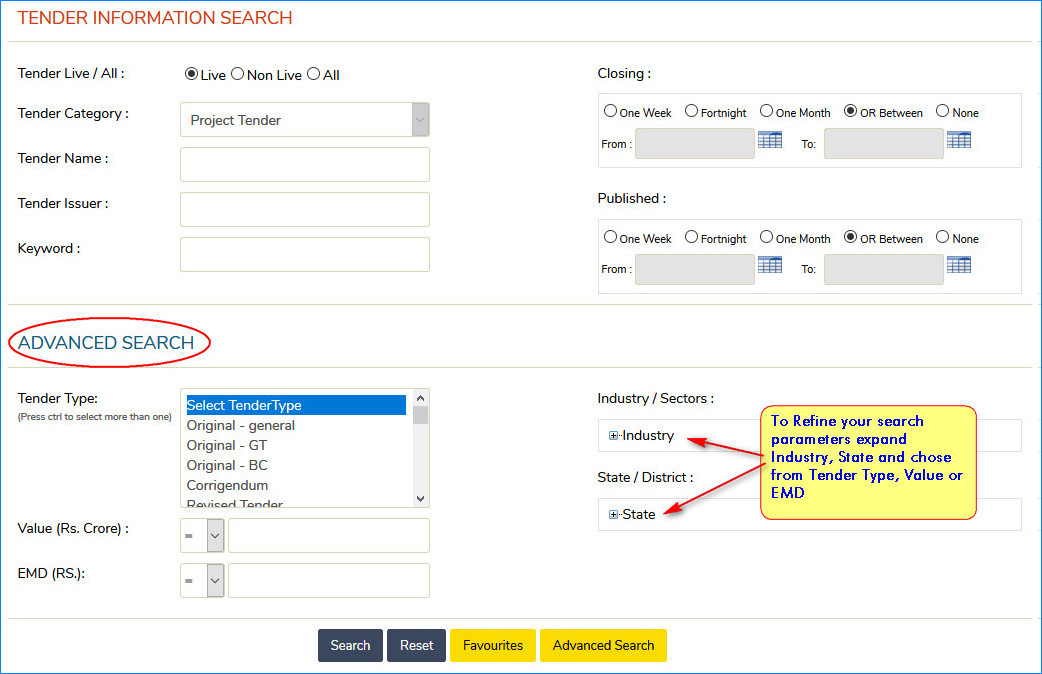 - In the Advanced search, you may search tenders by Type, Job Value, EMD, Sectors, States, Districts, etc.