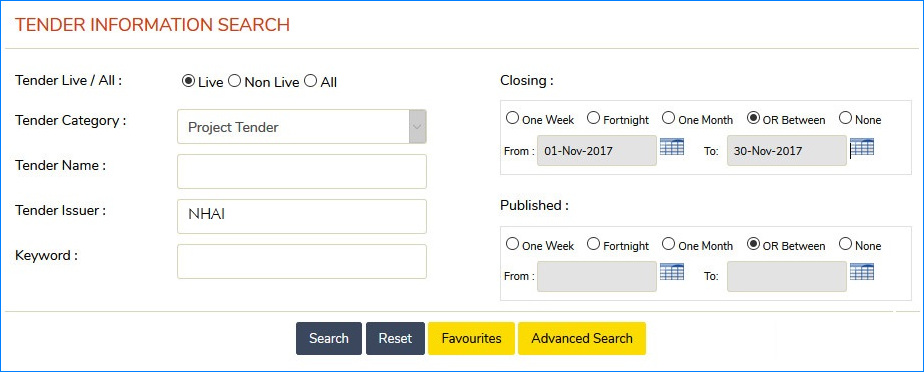 - Using the Simple Tender Search query you can search for Project Tenders Published or having Closing dates within a week, fortnight or one month. You can even search by providing beginning and end dates.