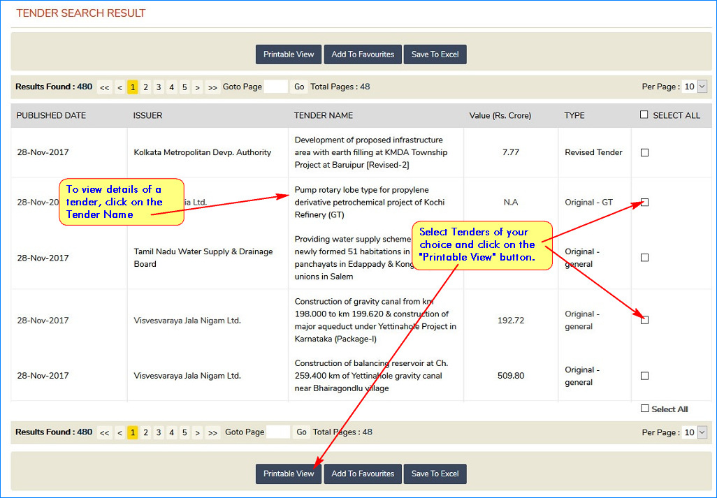 - To view details of more than one Tender select the respective boxes found at the end of the Tender names and click on Printable View button.