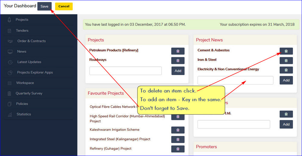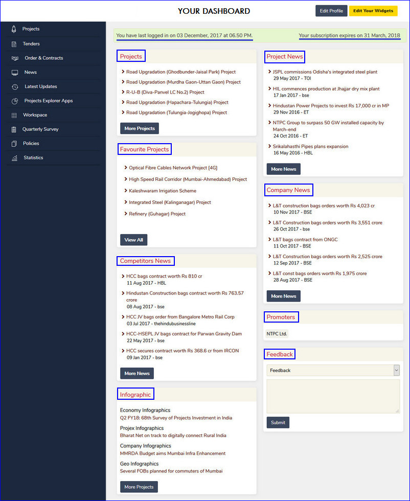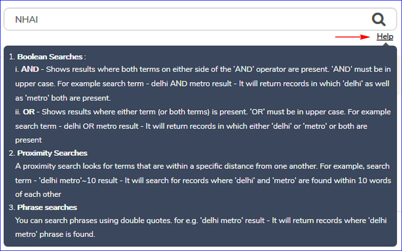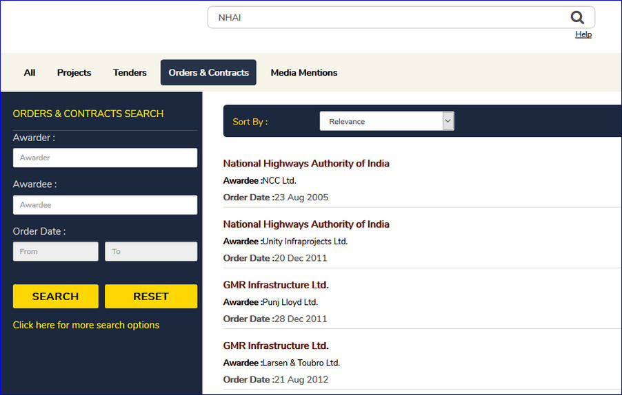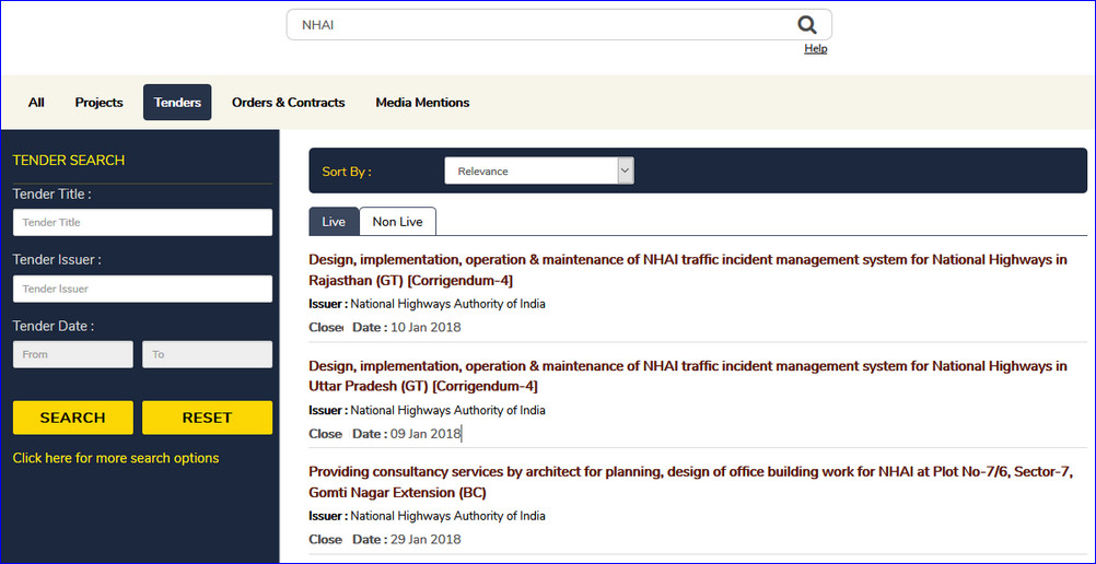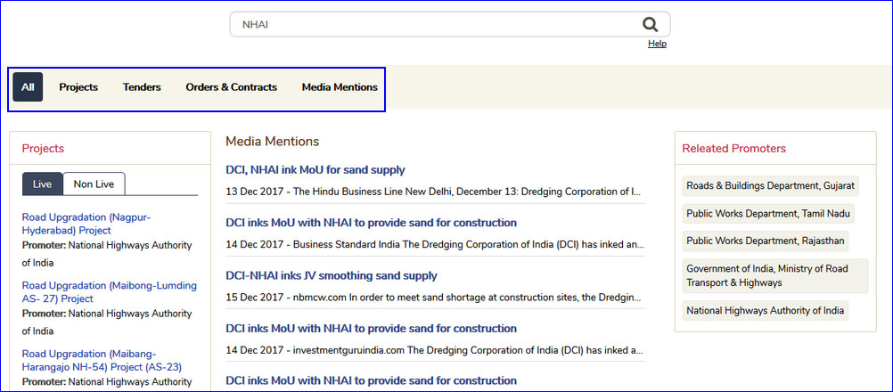 - If you type say "NHAI projects in Maharashtra", it will return a list projects being set up by NHAI in Maharashtra, NHAI tenders, NHAI orders and media mention about NHAI.