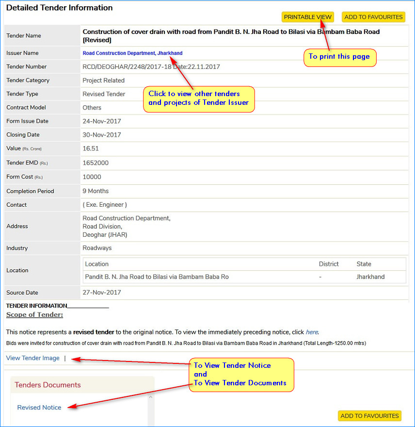- To facilitate downloading of tender documents, respective url links are given wherever such links are provided by the tender issuer Along with the Tender details, scanned images of tender Notices and tender related documents are provided wherever available.