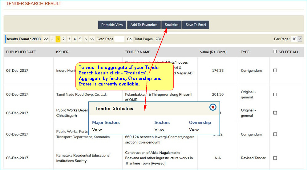- Apart from the above two parameters, you can also query the tenders database by Name of the Issuer, Tender Name, Key words mentioned in the scope of tender notices.