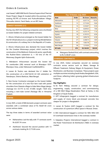 Orders & ContractsAugust 202516www.projectstoday.comcoal-based 1x800 MW North Chennai Supercritical Thermal Power Project, Stage-III, located within the premises of the existing NCTPS at Ennore and Puzhudhivakkam Village, Thiruvallur district, Tamil Nadu, on an EPC basis.LOWEST BIDDERS (L1)During July 2025 the following companies were shortlisted as lowest bidders for project related contracts.1. Afcons Infrastructure emerged as the lowest bidder for the HZ Infrastruktura d.o.o. project involving Rehabilitation & construction of a railway line in the Republic of Croatia.2. Afcons Infrastructure also declared the lowest bidder for the Croatian Motorways project, which involves the construction of the Metkovi%u0107%u2013Dubrovnik sector, specifically the Rudine%u2013Slano subsection (L = 9.0 km) of the A1 Motorway (Zagreb%u2013Split%u2013Dubrovnik).3. Mahalaxmi Infracontract secured the lowest bid for overburden (OB) removal work at Bharatpur OCP, Bharatpur Area, under Mahanadi Coalfields(MCL).4. Larsen & Toubro was declared the L1 bidder for the construction of a 220/132/33 kV GIS substation at Nandanpur, District Bankura, West Bengal.5. Ram Kumar Contractor emerged as the lowest bidder for the construction of a new four-lane road with paved shoulders from Dareota village to Kalar Bala village (design chainage km 33.175 to Km 41.000; length: 7.825 km), including a twin-tube tunnel (Package IIB) in Himachal Pradesh.STATESIn July 2025, a total of 668 domestic project contracts were awarded, with a combined value of Rs 56,821.92 crore across various states. The top three states in terms of awarded contract value were:%u2022%u0009Maharashtra: Led the tally with 77 contracts worth Rs 6,037.74 crore.%u2022%u0009Jharkhand: Secured the second position with 13 contracts totaling Rs 5,715.06 crore.%u2022%u0009Telangana: Ranked third, with contracts amounting to Rs 5,536.87 crore.OVERSEAS CONTRACTSIn July 2025, Indian companies secured six overseas contracts across sectors such as Water, Sewage & Effluent Treatment, Railway Wagon & Equipment, Power Distribution, and Business Complexes. These projects span multiple countries including Saudi Arabia, Bangladesh, USA, and Oman, reflecting India%u2019s growing global infrastructure footprint.Key Highlights:1. Va Tech Wabag secured a contract for design, engineering, supply, construction, and commissioning of a 300 MLD Mega Desalination Plant at Yanbu, in the Kingdom of Saudi Arabia.2. GPT Infraprojects bagged a contract for manufacture and supply of mono block pre-stressed concrete line sleeper for project in Bangladesh.3. Larsen & Toubro (L&T) bagged a contract for the construction of a premium office space in Muscat, Oman.4. KEC International bagged a contract for 500/ 400/ 220 kV overhead transmission lines in the overseas market.5. Kalpataru Projects International bagged a contract in the Power Transmission & Distribution (T&D) in overseas market.Top 10 States: July 2025StateMaharashtraJharkhandTelanganaBiharMadhya PradeshGujaratRajasthanHaryanaTamil NaduWest BengalAll IndiaOrder77131441331834276038674Rs Crore 6,037.745,715.065,536.874,649.624,235.194,103.553,894.782,268.721,963.781,510.0059,166.92Share(%)10.209.669.367.867.166.946.583.833.322.55100.00