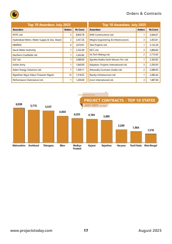 www.projectstoday.comAugust 2025Orders & Contracts17Top 10 Awarders: July 2025AwardersNTPC Ltd.Hyderabad Metro. Water Supply & Sew. BoardMMRDASaudi Water AuthorityNorthern Coalfields Ltd.DLF Ltd.Indian ArmyAdani Energy Solutions Ltd.Rajasthan Rajya Vidyut Prasaran NigamPerformance Chemiserve Ltd.Rs Crore8,830.785,457.263,674.912,332.002,302.852,089.001,640.001,349.111,318.551,200.00Orders52611111131Top 10 Awardees: July 2025AwardeesKNR Constructions Ltd.Megha Engineering & InfrastructuresTata Projects Ltd.NCC Ltd.Va Tech Wabag Ltd.Ajantha Radha Earth Movers Pvt. Ltd.Kalpataru Projects International Ltd.Ahluwalia Contracts (India) Ltd.Ramky Infrastructure Ltd.Ircon International Ltd.Rs Crore5,664.673,455.813,122.282,896.842,712.002,302.852,293.002,089.002,082.461,897.98Orders13132132136,038Maharashtra5,715JharkhandTelangana5,537Bihar4,650MadhyaPradesh4,235 Gujarat4,104 Rajasthan3,895Haryana2,269Tamil Nadu1,964West Bengal1,510JULY 2025(RS. CRORE)PROJECT CONTRACTS - TOP 10 STATES