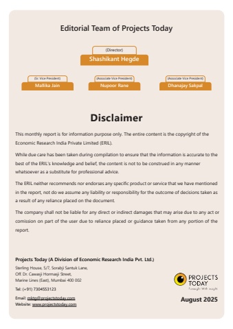 Economic Review August 20252www.projectstoday.comdf v vDisclaimerThis monthly report is for information purpose only. The entire content is the copyright of the Economic Research India Private Limited (ERIL).While due care has been taken during compilation to ensure that the information is accurate to the best of the ERIL%u2019s knowledge and belief, the content is not to be construed in any manner whatsoever as a substitute for professional advice.The ERIL neither recommends nor endorses any specific product or service that we have mentioned in the report, not do we assume any liability or responsibility for the outcome of decisions taken as a result of any reliance placed on the document.The company shall not be liable for any direct or indirect damages that may arise due to any act or comission on part of the user due to reliance placed or guidance taken from any portion of the report.Projects Today (A Division of Economic Research India Pvt. Ltd.)Sterling House, 5/7, Sorabji Santuk Lane,Off. Dr. Cawasji Hormasji Street,Marine Lines (East), Mumbai 400 002Tel: (+91) 7304553123Email: mktg@projectstoday.comWebsite: www.projectstoday.comAugust 2025Editorial Team of Projects TodayShashikant Hegde(Director)Nupoor Rane(Associate Vice President)Mallika Jain(Sr. Vice President)Dhanajay Sakpal(Associate Vice President)