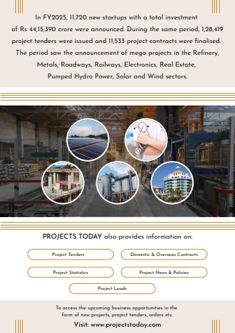 StatisticsAugust 202522www.projectstoday.comIn FY2025, 11,720 new startups with a total investment of Rs 44,15,390 crore were announced. During the same period, 1,28,419project tenders were issued and 11,533 project contracts were finalised. The period saw the announcement of mega projects in the Refinery,Metals, Roadways, Railways, Electronics, Real Estate, Pumped Hydro Power, Solar and Wind sectors.PROJECTS TODAY also provides information on:To access the upcoming business opportunities in the form of new projects, project tenders, orders etc.Visit: www.projectstoday.comProject TendersDomestic & Overseas ContractsProject StatisticsProject News & PoliciesProject Leads