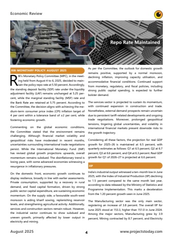 Economic Review August 20254www.projectstoday.com RBI MONETARY POLICY: AUGUST 2025RBI%u2019s Monetary Policy Committee (MPC), in the meeting held from August 4 to 6, 2025, decided to maintain the policy repo rate at 5.50 percent. Accordingly, the standing deposit facility (SDF) rate under the liquidity adjustment facility (LAF) remains unchanged at 5.25 percent, while the marginal standing facility (MSF) rate and the Bank Rate are retained at 5.75 percent. According to the Committee, the decision aligns with achieving the medium-term consumer price index (CPI) inflation target of 4 per cent within a tolerance band of %u00b12 per cent, while fostering economic growth.Commenting on the global economic conditions, the Committee stated that the environment remains challenging. Although financial market volatility and geopolitical risks have moderated in recent months, uncertainties surrounding international trade negotiations persist. While the International Monetary Fund (IMF) has revised global growth projections upwards, overall momentum remains subdued. The disinflationary trend is losing pace, with some advanced economies witnessing a resurgence in inflationary pressures.On the domestic front, economic growth continues to display resilience, broadly in line with earlier assessments. Private consumption, supported by a recovery in rural demand, and fixed capital formation, driven by strong public sector capital expenditure, are sustaining economic momentum. On the supply side, a favourable south-west monsoon is aiding kharif sowing, replenishing reservoir levels, and strengthening agricultural activity. Additionally, services and construction sectors remain robust. However, the industrial sector continues to show subdued and uneven growth, primarily affected by lower output in electricity and mining.As per the Committee, the outlook for domestic growth remains positive, supported by a normal monsoon, declining inflation, improving capacity utilisation, and accommodative financial conditions. Continued support from monetary, regulatory, and fiscal policies, including strong public capital spending, is expected to further bolster demand.The services sector is projected to sustain its momentum, with continued expansion in construction and trade. Nonetheless, external demand prospects remain uncertain due to persistent tariff-related developments and ongoing trade negotiations. Moreover, prolonged geopolitical tensions, lingering global uncertainties, and volatility in international financial markets present downside risks to the growth trajectory.Considering all these factors, the projection for real GDP growth for 2025%u201326 is maintained at 6.5 percent, with quarterly estimates as follows: Q1 at 6.5 percent, Q2 at 6.7 percent, Q3 at 6.6 percent, and Q4 at 6.3 percent. Real GDP growth for Q1 of 2026%u201327 is projected at 6.6 percent. IIPIndia%u2019s industrial output witnessed a ten-month low in June 2025, with the Index of Industrial Production (IIP) declining to 1.5 percent compared to the same month last year, according to data released by the Ministry of Statistics and Programme Implementation. This marks a deceleration from the 1.20 percent growth seen in June 2025. The Manufacturing sector was the only main sector, registering an increase of 3.8 percent. The overall IIP for June 2025 stood at 153.3, higher than 151.0 in June 2024. Among the major sectors, Manufacturing grew by 3.9 percent, Mining contracted by 8.7 percent, and Electricity