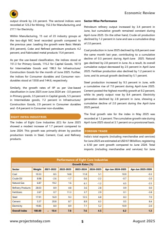 www.projectstoday.comAugust 2025Economic Review 5output shrank by 2.6 percent. The sectoral indices were recorded at 123.2 for Mining, 152.3 for Manufacturing, and 217.1 for Electricity.Within Manufacturing, 15 out of 23 industry groups at the two-digit NIC level recorded growth compared to the previous year. Leading the growth were Basic Metals (9.6 percent), Coke and Refined petroleum products 4.2 percent, and Fabricated metal products 15.4 percent.As per the use-based classification, the indices stood at 151.3 for Primary Goods, 115.2 for Capital Goods, 167.9 for Intermediate Goods and 198.3 for Infrastructure/Construction Goods for the month of June 2025. Further, the indices for Consumer durables and Consumer nondurables stood at 130.8 and 144.6, respectively.Similarly, the growth rates of IIP as per Use-based classification in June 2025 over June 2024 are -3.0 percent in Primary goods, 3.5 percent in Capital goods, 5.5 percent in Intermediate goods, 7.2 percent in Infrastructure/ Construction Goods, 2.9 percent in Consumer durables and -0.4 percent in Consumer non-durables.EIGHT INFRA INDUSTRIES The Index of Eight Core Industries (ICI) for June 2025 showed a modest increase of 1.7 percent compared to June 2024. This growth was primarily driven by positive production trends in Steel, Cement, Coal, and Refinery products.Sector-Wise PerformancePetroleum refinery output increased by 3.4 percent in June, but cumulative growth remained constant during April-June 2025. On the other hand, Crude oil production declined by 1.2 percent in June and saw a cumulative drop of 2.0 percent. Coal production in June 2025 declined by 6.8 percent over the same month last year, contributing to a cumulative decline of 0.3 percent during April-June 2025. Natural gas declined by 2.8 percent in June. As a result, its overall cumulative output decreased by 2.5 percent in April-June 2025. Fertiliser production also declined by 1.2 percent in June, and its annual growth declined by 5.1 percent.Steel production increased by 9.3 percent in June, with a cumulative rise of 7.0 percent during April-June 2025. Cement posted the highest monthly growth at 9.2 percent, while its yearly output rose by 8.4 percent. Electricity generation declined by 2.8 percent in June, showing a cumulative decline of 2.0 percent during the April-June 2025 period.The final growth rate for the index in May 2025 was recorded at 1.2 percent. The cumulative growth rate during April-June 2025 stood at 3.1 percent on a provisional basis.FOREIGN TRADEIndia%u2019s total exports (including merchandise and services) for June 2025 are estimated at USD 67.98 billion, registering a 6.50 per cent growth compared to June 2024. Total imports (including merchandise and services) for June Performance of Eight Core IndustriesGrowth Rates (%)SectorCoalCrude OilNatural GasRefinery ProductsFertilizersSteelCementElectricityOverall IndexWeight10.338.986.8728.032.6717.915.3719.85100.002021-20228.5-2.619.28.90.716.920.88.010.42022-202314.8-1.71.64.811.39.38.78.97.82023-202411.80.66.13.63.712.58.97.17.62024-20255.1-2.2-1.22.82.96.86.35.24.5Apr-Jun 2024-202510.9-0.76.50.90.18.30.510.96.2Apr-Jun 2025-2026-0.3-2.0-2.50.0-3.87.08.4-2.01.3