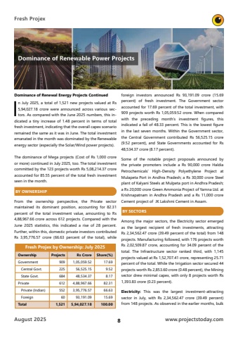 Fresh ProjexAugust 20258www.projectstoday.comDominance of Renewal Energy Projects ContinuedIn July 2025, a total of 1,521 new projects valued at Rs 5,94,027.18 crore were announced across various sectors. As compared with the June 2025 numbers, this indicated a tiny increase of 1.48 percent in terms of total fresh investment, indicating that the overall capex scenario remained the same as it was in June. The total investment emanated in the month was dominated by the Renewable energy sector (especially the Solar/Wind power projects).The dominance of Mega projects (Cost of Rs 1,000 crore or more) continued in July 2025, too. The total investment committed by the 123 projects worth Rs 5,08,214.37 crore accounted for 85.55 percent of the total fresh investment seen in the month.BY OWNERSHIPFrom the ownership perspective, the Private sector maintained its dominant position, accounting for 82.31 percent of the total investment value, amounting to Rs 4,88,967.66 crore across 612 projects. Compared with the June 2025 statistics, this indicated a rise of 28 percent. Further, within this, domestic private investors contributed Rs 3,95,776.57 crore (66.63 percent of the total), while foreign investors announced Rs 93,191.09 crore (15.69 percent) of fresh investment. The Government sector accounted for 17.69 percent of the total investment, with 909 projects worth Rs 1,05,059.52 crore. When compared with the preceding month%u2019s investment figures, this indicated a fall of 48.33 percent. This is the lowest figure in the last seven months. Within the Government sector, the Central Government contributed Rs 56,525.15 crore (9.52 percent), and State Governments accounted for Rs 48,534.37 crore (8.17 percent).Some of the notable project proposals announced by the private promoters include a Rs 90,000 crore Haldia Petrochemicals%u2019 High-Density Polyethylene Project at Mulapeta Port in Andhra Pradesh; a Rs 30,000 crore Steel plant of Kalyani Steels at Mulpeta port in Andhra Pradesh; a Rs 20,000 crore Green Ammonia Project of Yamna Ltd. at Krishnapatnam in Andhra Pradesh and a Rs 11,000 crore Cement project of JK Lakshmi Cement in Assam.BY SECTORSAmong the major sectors, the Electricity sector emerged as the largest recipient of fresh investments, attracting Rs 2,34,562.47 crore (39.49 percent of the total) from 148 projects. Manufacturing followed, with 176 projects worth Rs 2,02,509.87 crore, accounting for 34.09 percent of the total. The Infrastructure sector ranked third, with 1,145 projects valued at Rs 1,52,707.41 crore, representing 25.71 percent of the total. While the Irrigation sector secured 44 projects worth Rs 2,853.60 crore (0.48 percent), the Mining sector drew minimal capex, with only 8 projects worth Rs 1,393.83 crore (0.23 percent).Electricity: This was the largest investment-attracting sector in July, with Rs 2,34,562.47 crore (39.49 percent) from 148 projects. As observed in the earlier months, bulk Fresh Projex by Ownership: July 2025OwnershipGovernment Central Govt. State Govt.Private Private (Indian) ForeignTotalProjects909225684612552601,521Rs Crore1,05,059.5256,525.1548,534.374,88,967.663,95,776.5793,191.095,94,027.18Share(%)17.699.528.1782.3166.6315.69100.00