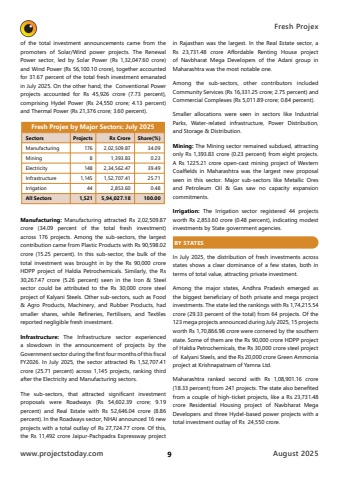 www.projectstoday.comAugust 2025Fresh Projex9of the total investment announcements came from the promoters of Solar/Wind power projects. The Renewal Power sector, led by Solar Power (Rs 1,32,047.60 crore) and Wind Power (Rs 56,100.10 crore), together accounted for 31.67 percent of the total fresh investment emanated in July 2025. On the other hand, the Conventional Power projects accounted for Rs 45,926 crore (7.73 percent), comprising Hydel Power (Rs 24,550 crore; 4.13 percent) and Thermal Power (Rs 21,376 crore; 3.60 percent).Manufacturing: Manufacturing attracted Rs 2,02,509.87 crore (34.09 percent of the total fresh investment) across 176 projects. Among the sub-sectors, the largest contribution came from Plastic Products with Rs 90,598.02 crore (15.25 percent). In this sub-sector, the bulk of the total investment was brought in by the Rs 90,000 crore HDPP project of Haldia Petrochemicals. Similarly, the Rs 30,267.47 crore (5.26 percent) seen in the Iron & Steel sector could be attributed to the Rs 30,000 crore steel project of Kalyani Steels. Other sub-sectors, such as Food & Agro Products, Machinery, and Rubber Products, had smaller shares, while Refineries, Fertilisers, and Textiles reported negligible fresh investment.Infrastructure: The Infrastructure sector experienced a slowdown in the announcement of projects by the Government sector during the first four months of this fiscal FY2026. In July 2025, the sector attracted Rs 1,52,707.41 crore (25.71 percent) across 1,145 projects, ranking third after the Electricity and Manufacturing sectors. The sub-sectors, that attracted significant investment proposals were Roadways (Rs 54,602.39 crore; 9.19 percent) and Real Estate with Rs 52,646.04 crore (8.86 percent). In the Roadways sector, NHAI announced 16 new projects with a total outlay of Rs 27,724.77 crore. Of this, the Rs 11,492 crore Jaipur-Pachpadra Expressway project in Rajasthan was the largest. In the Real Estate sector, a Rs 23,731.48 crore Affordable Renting House project of Navbharat Mega Developers of the Adani group in Maharashtra was the most notable one.Among the sub-sectors, other contributors included Community Services (Rs 16,331.25 crore; 2.75 percent) and Commercial Complexes (Rs 5,011.89 crore; 0.84 percent). Smaller allocations were seen in sectors like Industrial Parks, Water-related infrastructure, Power Distribution, and Storage & Distribution. Mining: The Mining sector remained subdued, attracting only Rs 1,393.83 crore (0.23 percent) from eight projects. A Rs 1225.21 crore open-cast mining project of Western Coalfields in Maharashtra was the largest new proposal seen in this sector. Major sub-sectors like Metallic Ores and Petroleum Oil & Gas saw no capacity expansion commitments.Irrigation: The Irrigation sector registered 44 projects worth Rs 2,853.60 crore (0.48 percent), indicating modest investments by State government agencies.BY STATESIn July 2025, the distribution of fresh investments across states shows a clear dominance of a few states, both in terms of total value, attracting private investment.Among the major states, Andhra Pradesh emerged as the biggest beneficiary of both private and mega project investments. The state led the rankings with Rs 1,74,215.54 crore (29.33 percent of the total) from 64 projects. Of the 123 mega projects announced during July 2025, 15 projects worth Rs 1,70,866.98 crore were cornered by the southern state. Some of them are the Rs 90,000 crore HDPP project of Haldia Petrochemicals, the Rs 30,000 crore steel project of Kalyani Steels, and the Rs 20,000 crore Green Ammonia project at Krishnapatnam of Yamna Ltd.Maharashtra ranked second with Rs 1,08,901.16 crore (18.33 percent) from 241 projects. The state also benefited from a couple of high-ticket projects, like a Rs 23,731.48 crore Residential Housing project of Navbharat Mega Developers and three Hydel-based power projects with a total investment outlay of Rs 24,550 crore.Fresh Projex by Major Sectors: July 2025SectorsManufacturingMiningElectricityInfrastructureIrrigationAll SectorsProjects17681481,145441,521Rs Crore2,02,509.871,393.832,34,562.471,52,707.412,853.605,94,027.18Share(%)34.090.2339.4925.710.48100.00